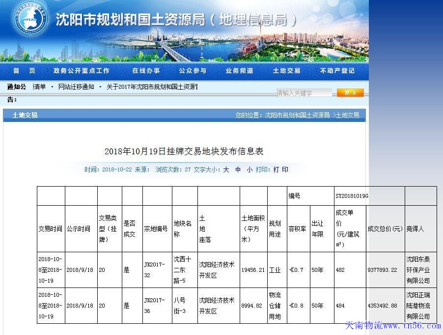 據沈陽市規劃和國土資源局10月22日公告,于今年10月8日至10月19日掛牌交易的沈西十二東路-5地塊、八號街-3地塊已成交,競得人分別為沈陽東泰環保產業有限公司、沈陽物流正瑞陸港物流有限公司,總面積約28.45萬平,規劃用途分別為工業用地、物流倉儲用地。